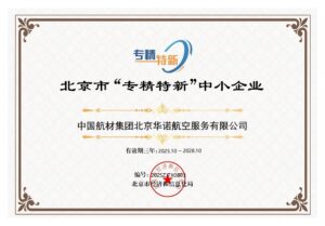 2025年10月,迎来了振奋人心的喜讯 —— 中国航材集团北京华诺航空服务有限公司(以下简称“华诺公司”或“公司”)凭借卓越的专业能力、精细的管理模式、独特的产品特色以及持续的创新能力,成功通过层层审核,荣获北京市 “专精特新” 中小企业称号。这一称号的获得不仅是对华诺公司多年来深耕民航保障、砥砺前行的高度认可,更是公司发展历程中的一座重要里程碑。
